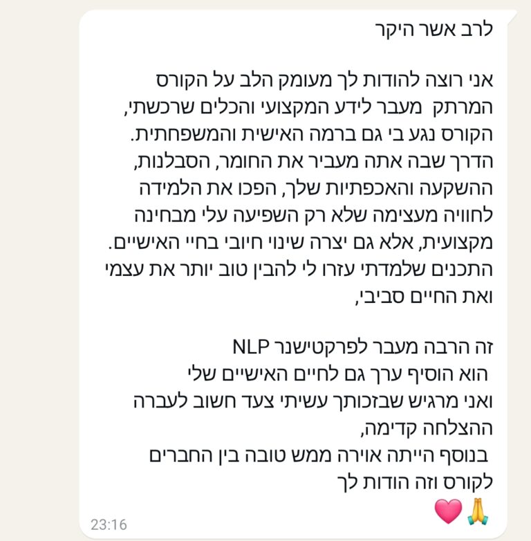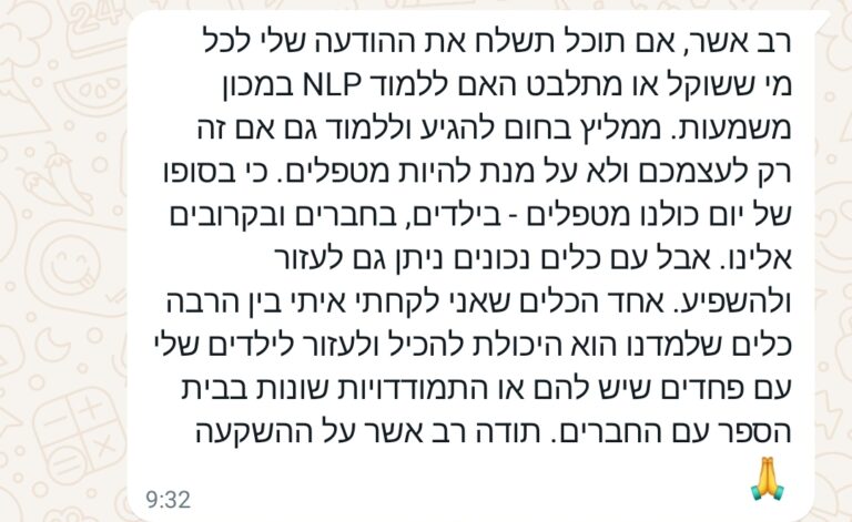 ה-NLP הוא בונוס אדיר לכל יועצת, מטפלת, מנהלת או נותנת שירות. התעודה שתקבלי היא בינלאומית ומוכרת, ותאפשר לך לשדרג את השירות שאת נותנת ללקוחות שלך (ואפילו לגבות על זה יותר).